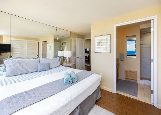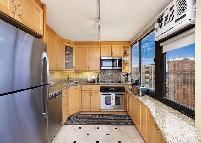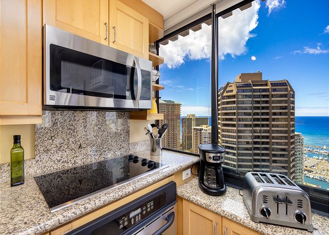This elegant corner unit (674 sq. ft.) offers 1 King Size bed, a flat screen TV, 1 full bath, and includes a fully equipped gourmet kitchen with natural-wood cabinets, granite counters, and upgraded dishwasher & appliances. Recently renovated flooring, a luxurious leather sofa, and fresh paint throughout the condo. Amenities include A/C, cable, free Wi Fi, washer/dryer, ample closet space, bedding & towels. This modernized, secure, gated, non-smoking building offers a covered parking space, heated pool/jacuzzi, putting green, walking path, exercise room, and the most spectacular views of Honolulu from the glass-enclosed, rooftop sky terrace on the 45th floor (BBQ area and party room available on reserve). The famous Ala Moana Shopping Center is 2 blocks away for shopping, entertainment and dining; less than 15 minutes from Chinatown and downtown Honolulu; and only 20 minutes away from the airport.